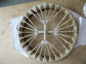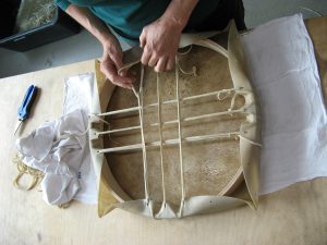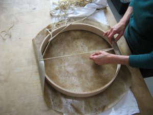Aus gewässerter Hirschrohhaut, runden Holzrahmen und Rohhautschnüren entstehen Rahmentrommeln.